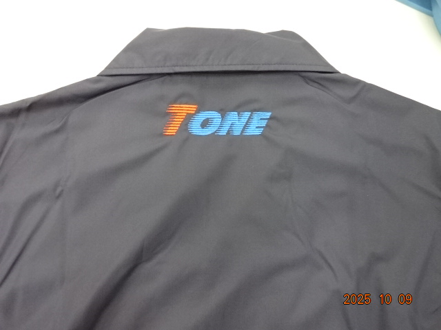 「TONE」オリジナルジャケット制作事例 商品カテゴリ: 3 商品: 3154 利用シーン: 加工位置: 刺繍(背中衿下、左胸) 加工サイズ: 背中衿下:100mm×29mm、左胸:100mm×29mm 加工方法: カメオカからのコメント:
