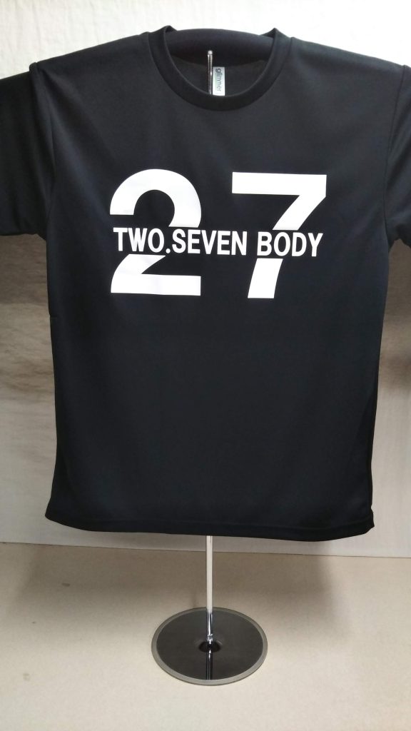 「TWO SEVEN BODY」オリジナルTシャツ制作事例 DSC_5632 商品カテゴリ: 8 商品: 531 利用シーン: 加工位置: プリント(胸全面) 加工サイズ: 300mm×167mm 加工方法: カメオカからのコメント: