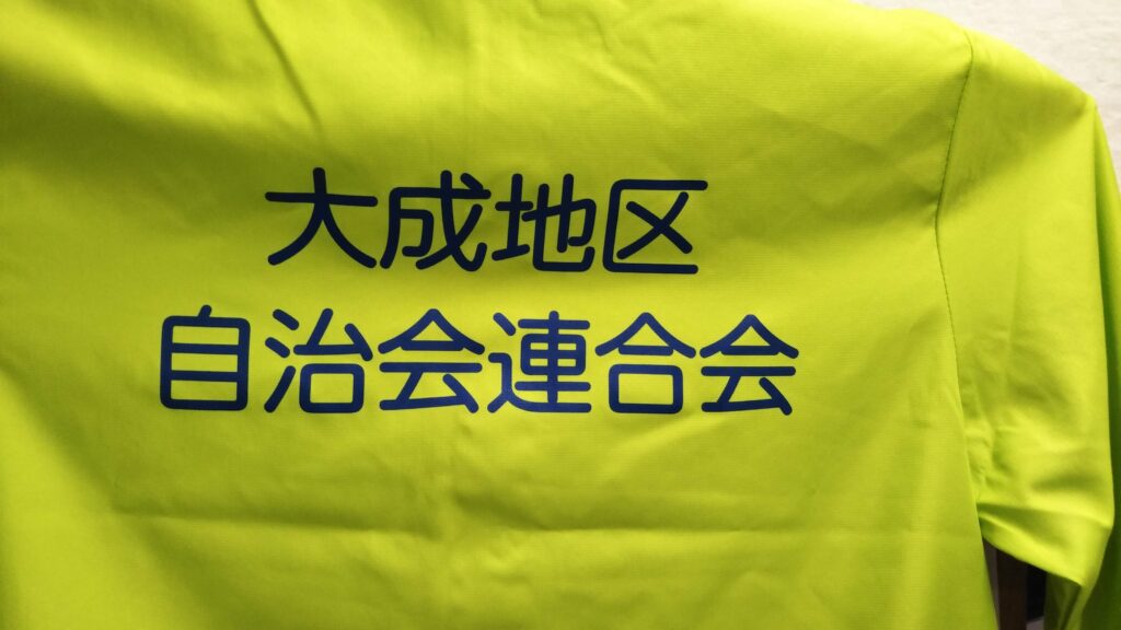 「大成地区自治会連合会」オリジナルジャケット制作事例 DSC_5093 商品カテゴリ: 3 商品: 1286 利用シーン: 加工位置: 背中 加工サイズ: 横:280㎜×縦:109㎜ 加工方法: プリント カメオカからのコメント: