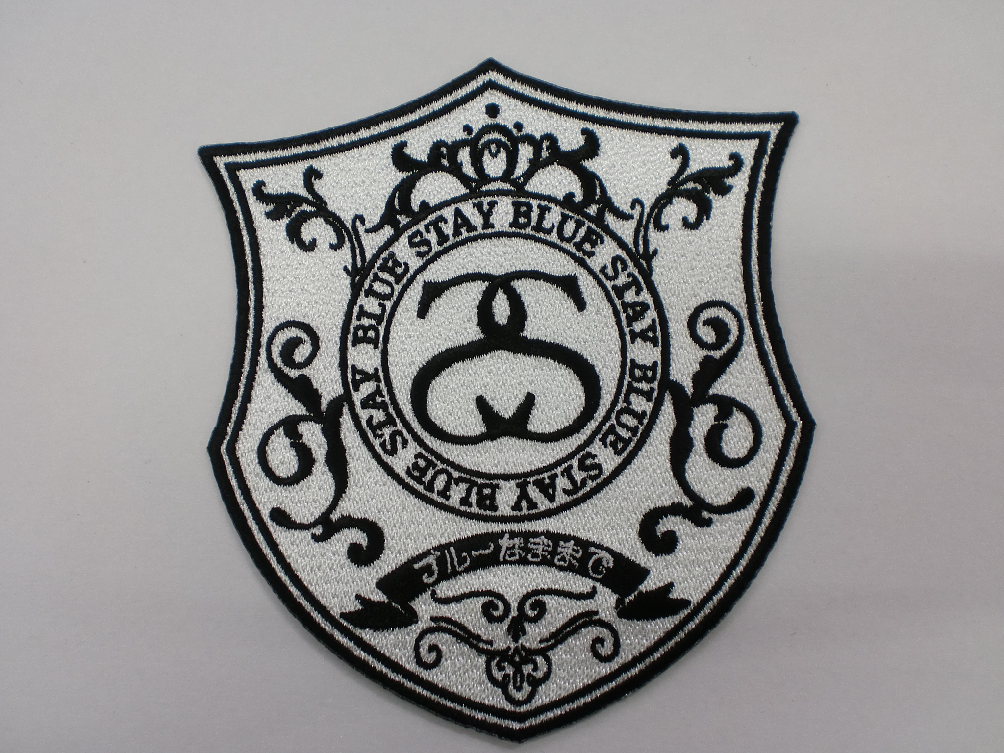 「STAY BLUEアラベスク・エンブレム」オリジナル刺繍ワッペン制作事例 商品カテゴリ: 277 商品: 利用シーン: 加工位置: 刺繍 加工サイズ: 横:100㎜×縦:111㎜ 加工方法: オリジナルワッペン カメオカからのコメント: