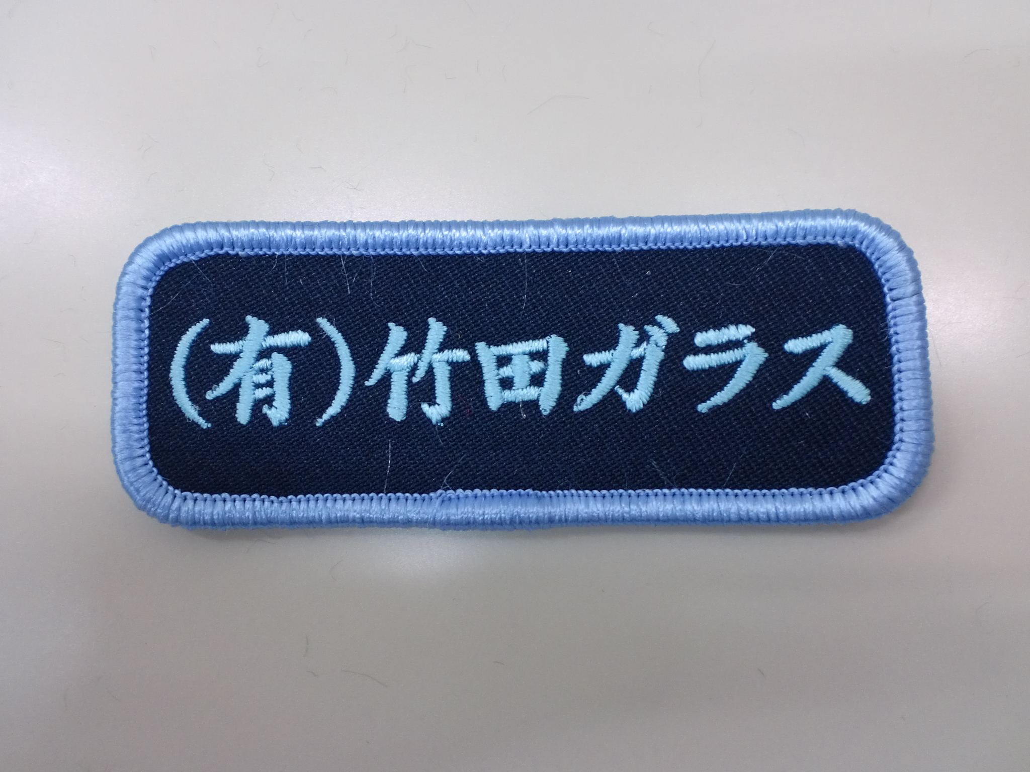 「(有)竹田ガラス」ネーム刺繍ワッペン制作事例 商品カテゴリ: 277 商品: 利用シーン: 加工位置: 刺繍 加工サイズ: 横:83㎜×縦:32㎜ 加工方法: ネームワッペン カメオカからのコメント: