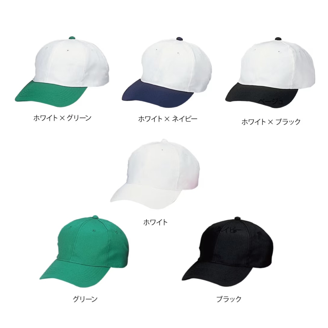 白のキャップをお探しなら、ぜひツートンデザインを選択肢に入れてみてはいかがでしょうか。この商品には、ホワイトはもちろん、グリーン、ブラックの3色だけでなく、ホワイトをベースにしたツートンデザインを3種類ほどご用意しています。清潔感のあるホワイトもよいですが、ひさしと天ボタンにカラーを配色したデザインは、白だけのよさを残しつつまた違った味わいを演出してくれます。またオリジナル加工を施しても最適。シンプルだからこそいろいろな楽しみかたができるのもこの商品の魅力です。