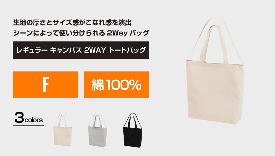 8.3オンスのキャンバス生地を採用した、トート・ショルダーの2WAY仕様バッグ。内ポケット付きで小物の収納にも便利です。程よいサイズ感と約16Lの容量で、日常使いはもちろん、イベントや販促シーンでの利用にも最適。肩掛けと手持ちをシーンに合わせて使い分けられるため、利便性が高く幅広い用途に対応可能です。法人ユニフォーム用やオリジナルグッズ制作にもおすすめです。