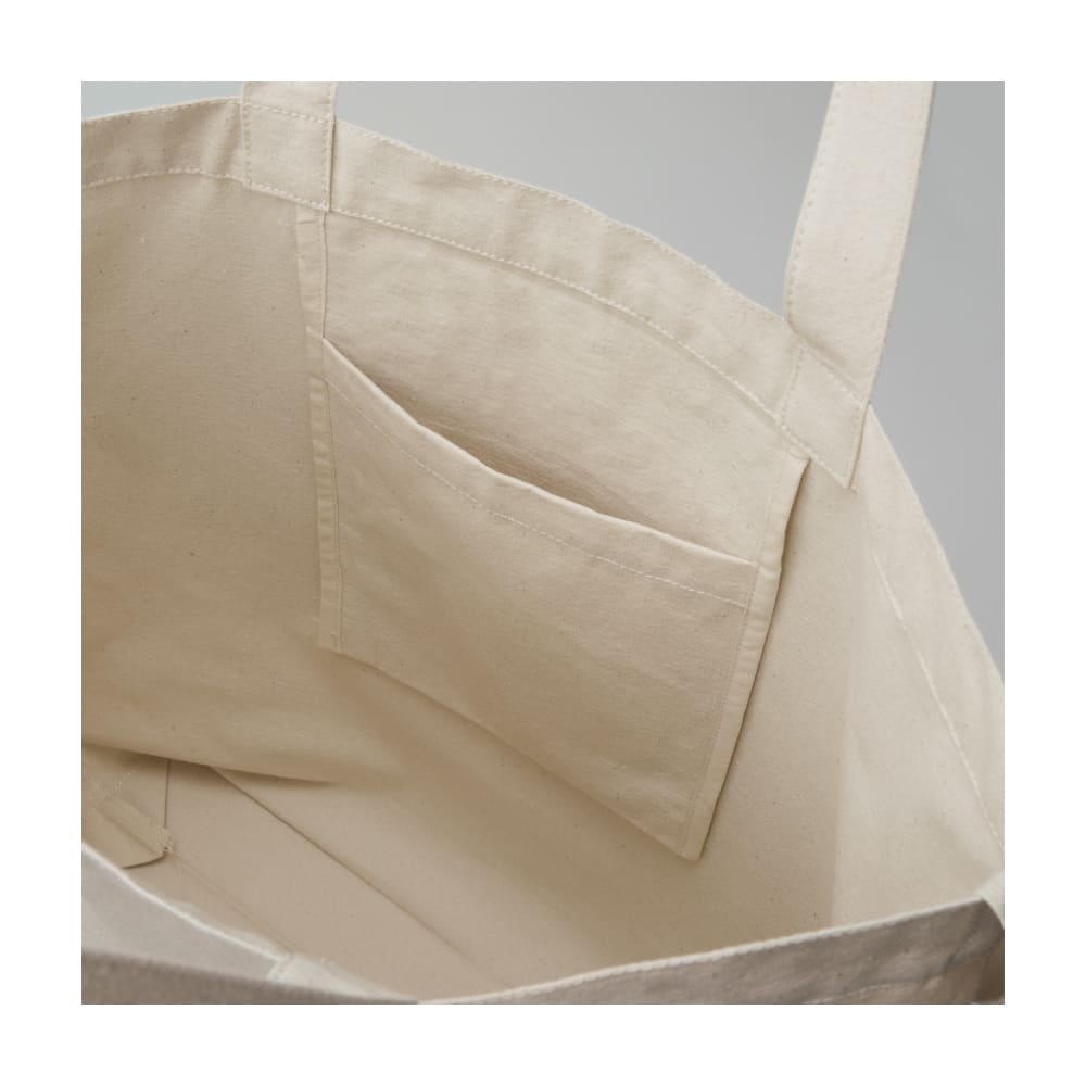 素材はコットン100%のキャンバス生地(280g/㎡ 8.3oz/yd2)を採用。適度な厚みと丈夫さを兼ね備え、長く使っても型崩れしにくい設計です。手持ち用の短いハンドルと、肩掛け可能なロングショルダーを装備。内ポケットは財布やスマートフォンなどの収納に最適で、必要なものをすぐに取り出せます。ナチュラルカラーは漂白工程を省いた環境配慮仕様です。