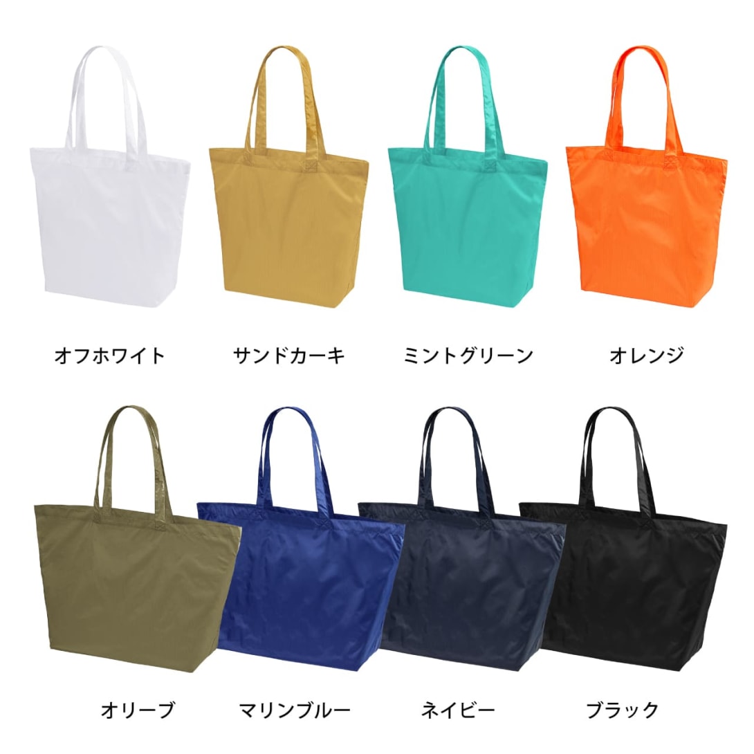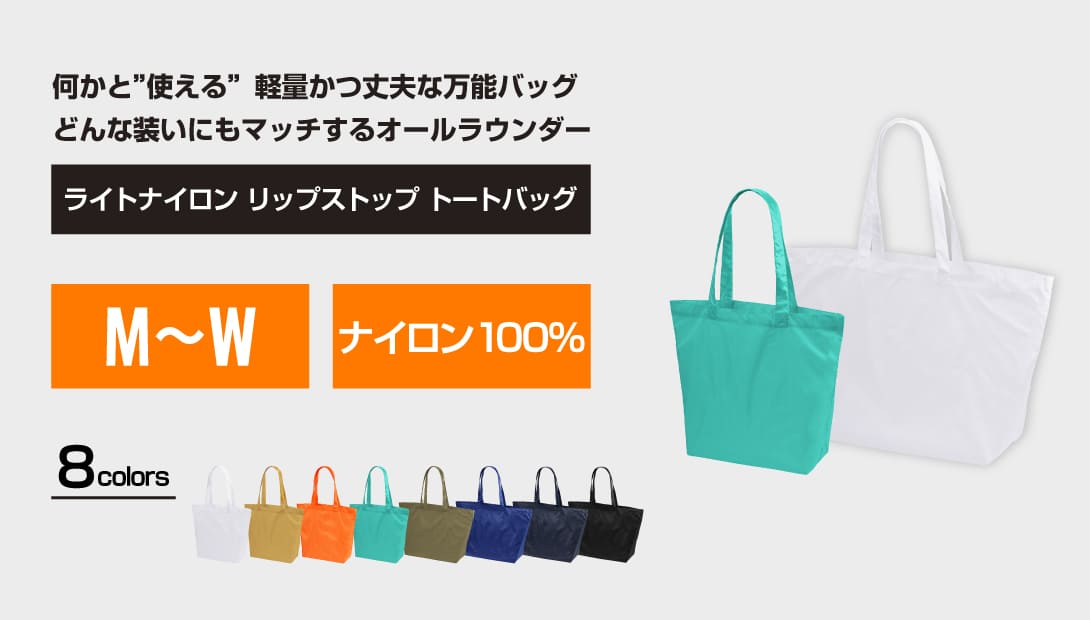 ナイロンリップストップ生地を採用し、軽量ながら耐久性に優れたトートバッグ。普段使いに便利なMサイズと、大容量のWサイズの2種類をラインナップ。薄手で軽い素材なので持ち運びやすく、折りたたんでの収納も可能です。シンプルなデザインで使いやすく、イベントやユニフォーム用のサブバッグとしてもおすすめ。刺繍やプリント加工によるカスタマイズで、企業や団体のオリジナルアイテムに仕上げられます。