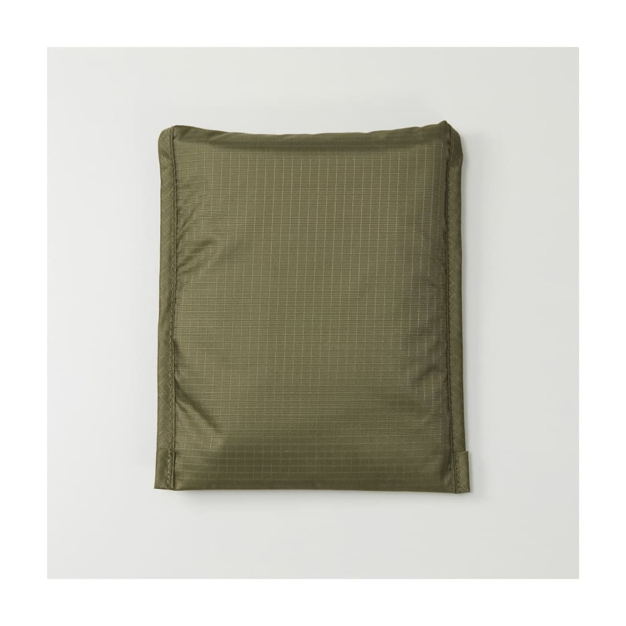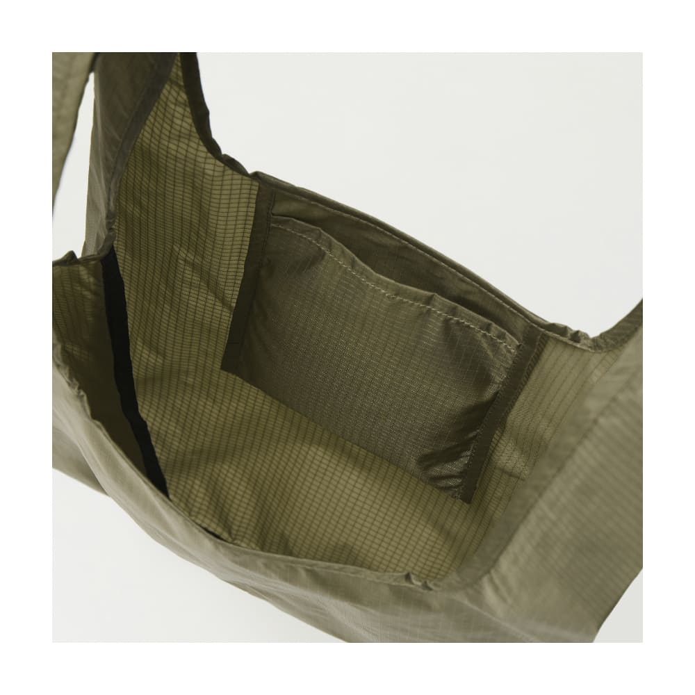 素材はナイロン100%のリップストップを採用し、軽量性と耐久性を兼備。内ポケット部分に本体を折りたたんで収納できるパッカブル仕様。ハンドルは肩掛けしやすい長さに設計されており、持ち運びが快適です。容量はSサイズ約12L、Mサイズ約19Lで、荷物量や用途に合わせて選択可能。折りたたみ時はコンパクトにまとまり、携帯性に優れています。