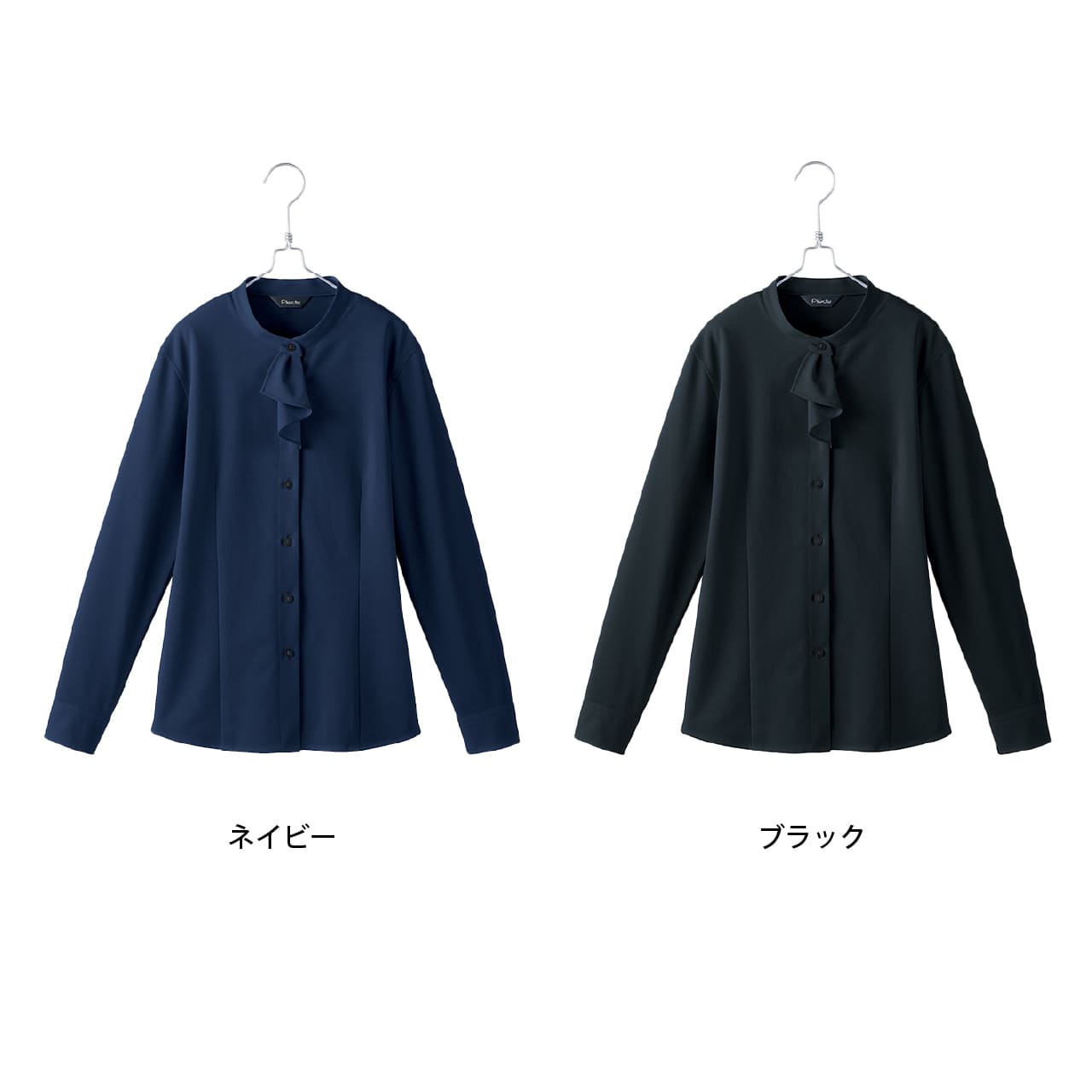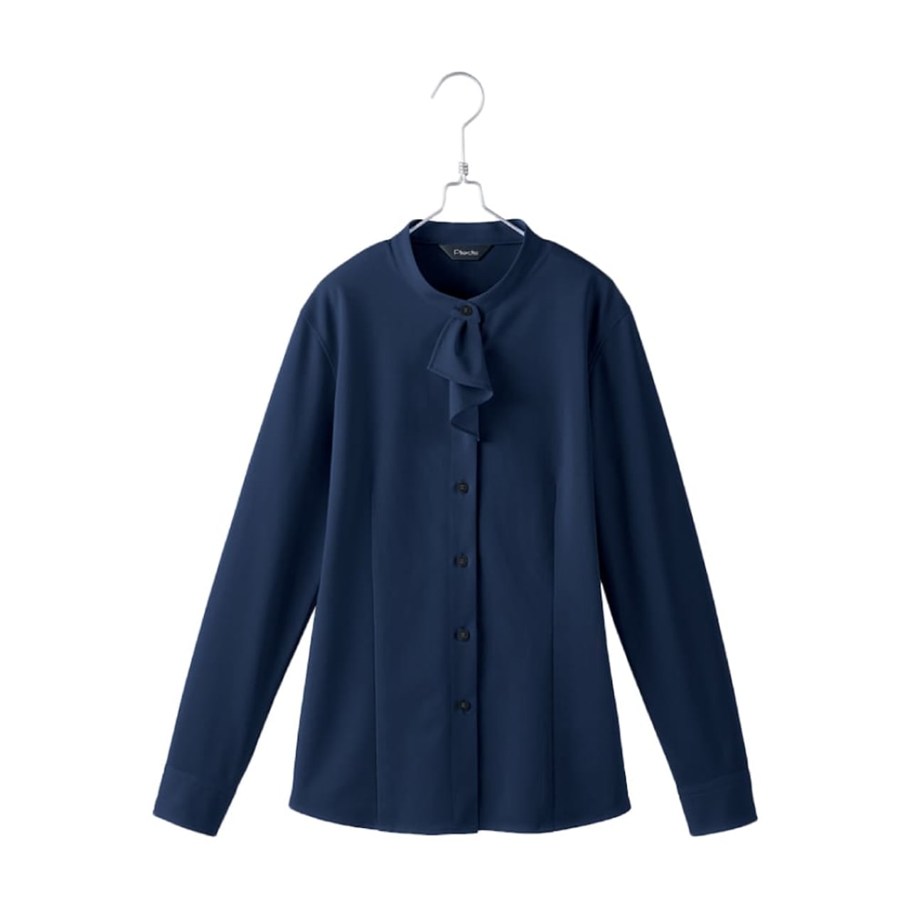 胸元のフリルデザインが華やかさと女性らしさを引き立てます。形態安定加工でノーアイロンでも美しいラインを保ち、ストレッチ素材が動きの多い業務でも快適。吸水速乾機能が汗を素早く乾かし、防汚加工で清潔感をキープ。ブラックはシックで引き締まった印象、ネイビーは柔らかく上品な印象を与えます。