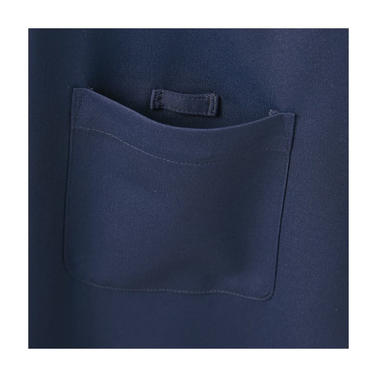 ポリエステル100%の形態安定素材。ストレッチ性と吸水速乾機能を備え、防汚加工で汚れが付きにくく落ちやすい。胸ポケットには名札ループ付き。
