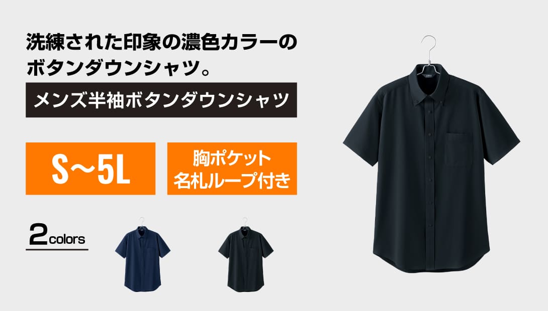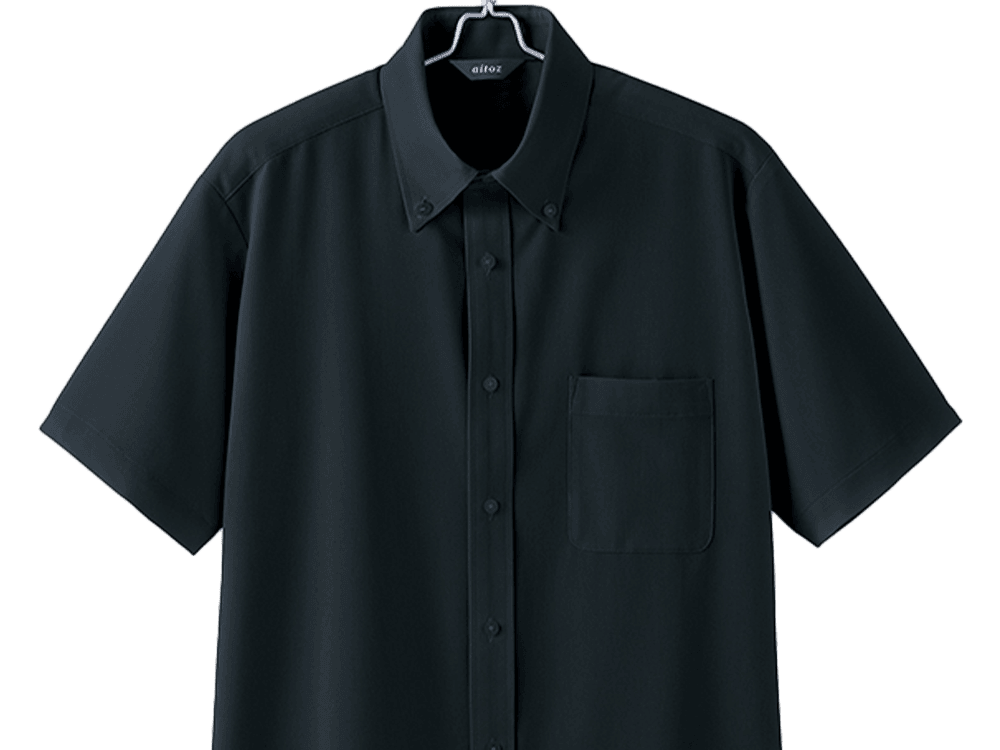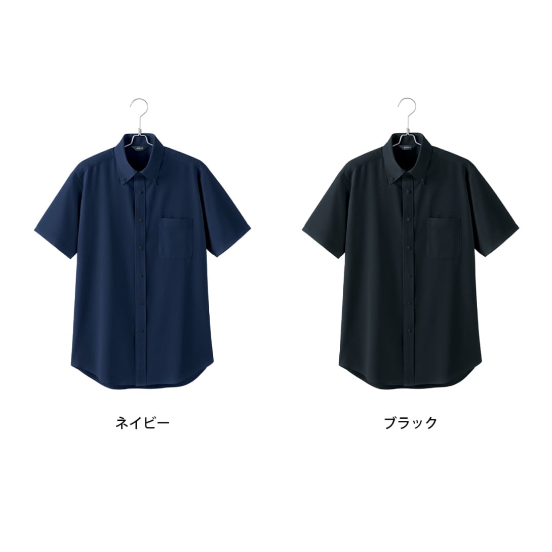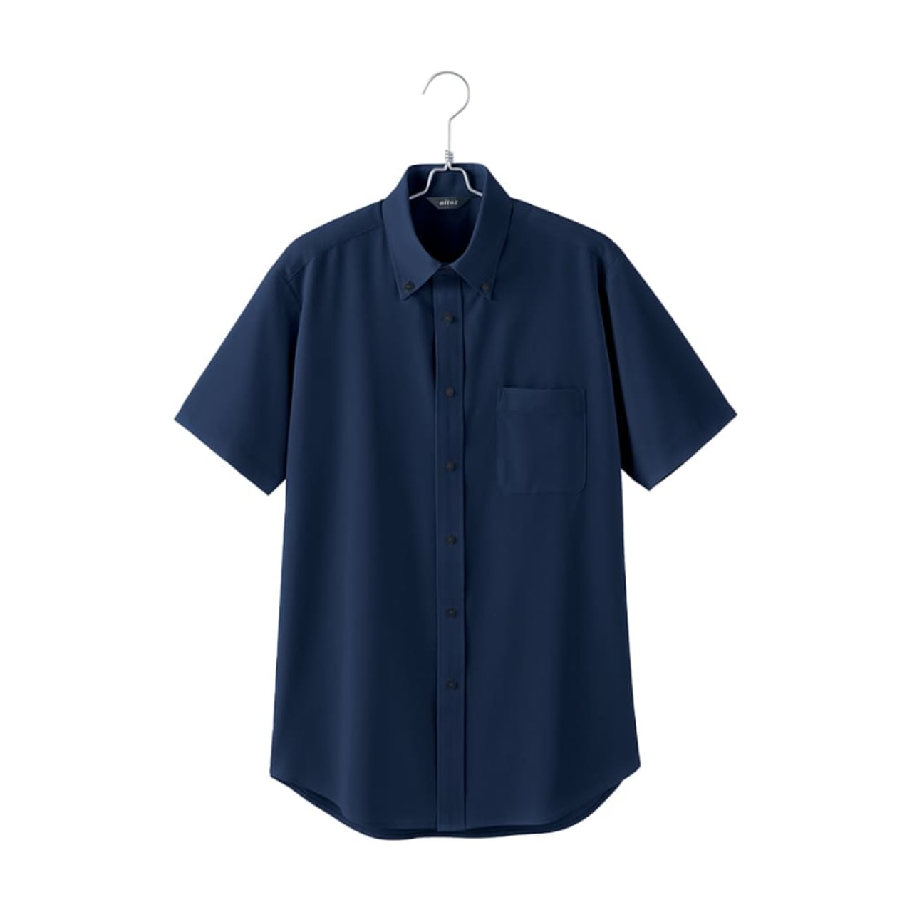 ボタンダウンの衿元でシャープな印象を演出。形態安定加工でアイロン不要、吸水速乾・ストレッチ・防汚機能付き。接客や営業、夏のイベントユニフォームに最適。