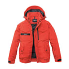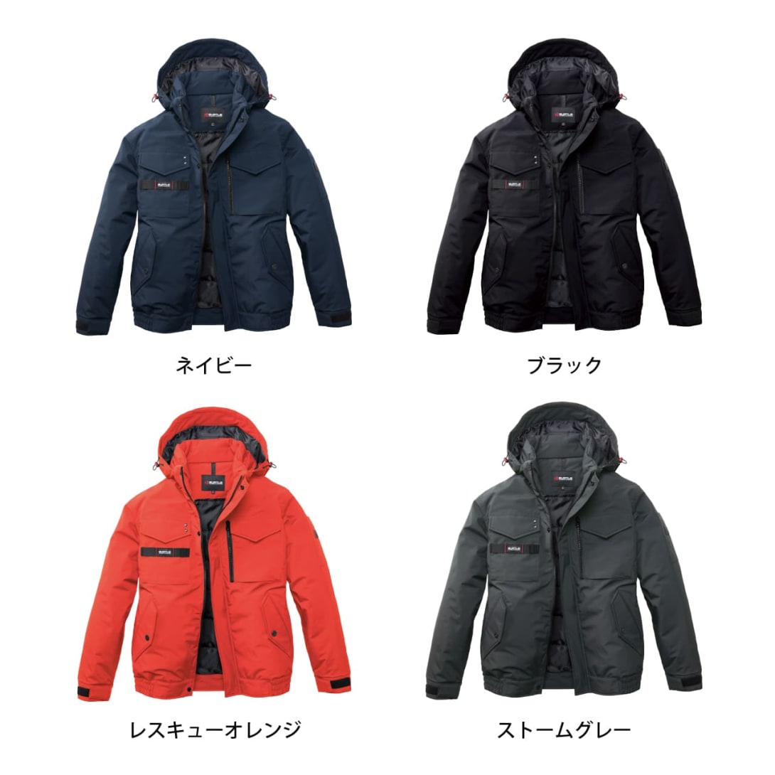 素材は表地にマイクロソフトシェル(ポリエステル100%、防水ラミネート加工)、裏地・中綿はポリエステル100%。耐水圧10,000mmの防水性と軽量性を兼備。フロントダブルファスナー、両胸ポケット、袖ポケット、ウエストポケットを装備。フードは着脱可能。サイズはS〜3XLまで展開し、ユニセックス対応です。