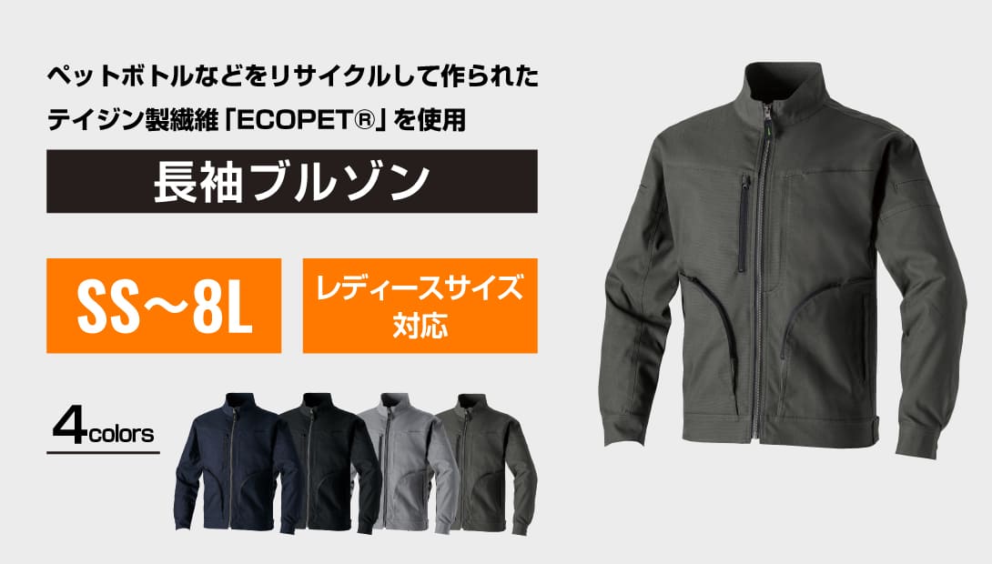 リサイクル繊維「ECOPET®」を使用したエコ素材ブルゾン。T/Cグログランを採用し、高い耐久性とストレッチ性を兼ね備えています。ノーフォーク仕様で腕や肩が動かしやすく、反射パイピングで夜間作業時の安全性も向上。さらに防臭テープを備え、不快なニオイを軽減します。法人ユニフォームにふさわしい機能性と環境対応を兼備したアイテムです。