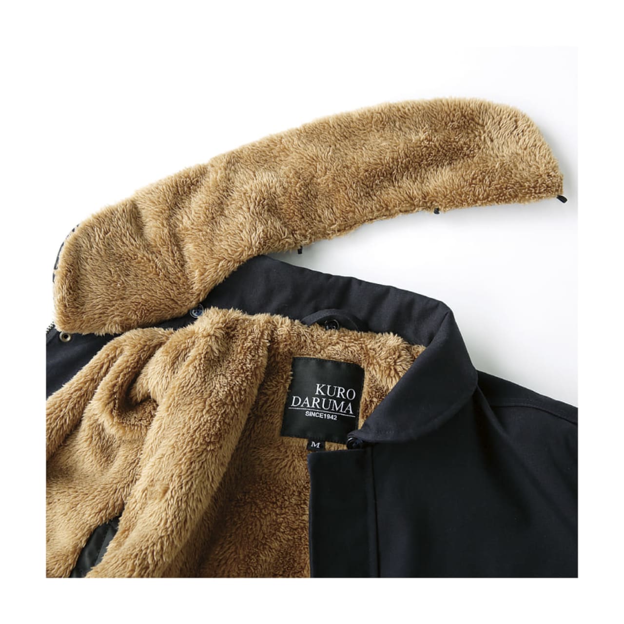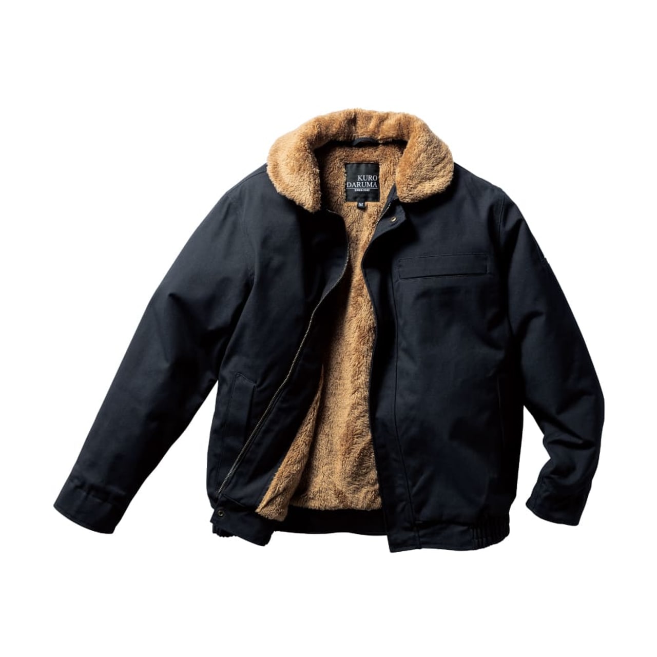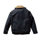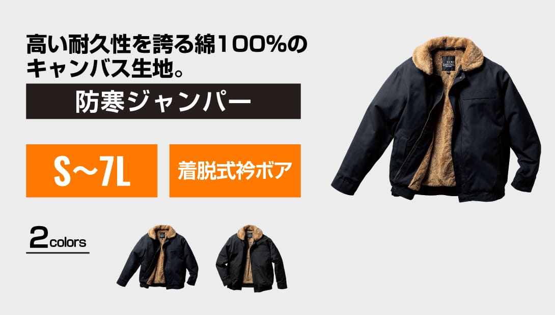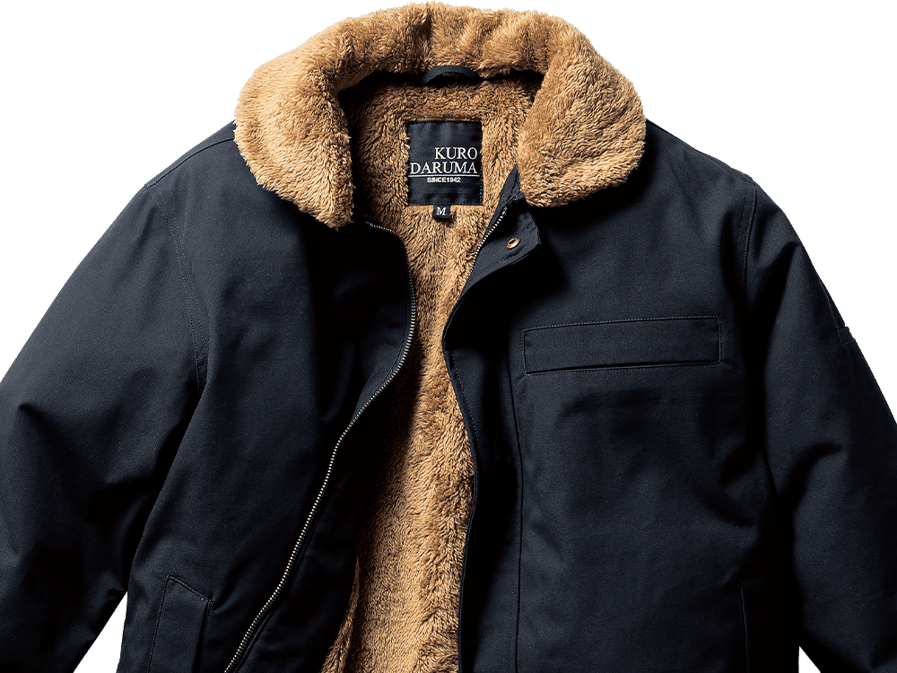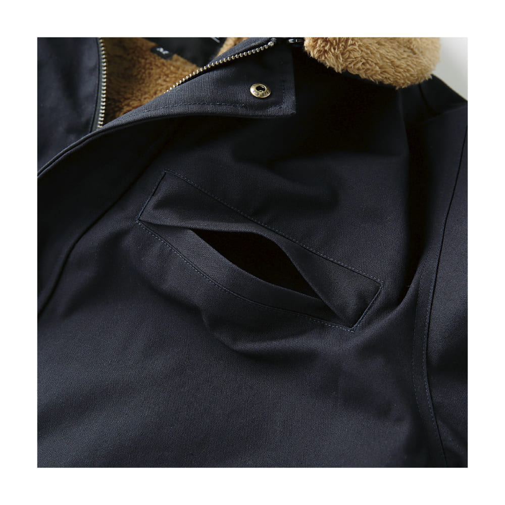 素材は綿100%のキャンバス生地を使用。裏地・襟・袖口にはボアを配置し、防寒性を強化。襟ボアは着脱可能で、シーズンに応じた使い分けが可能です。袖口と裾はリブ仕様で冷気の侵入を防止。前立ては比翼仕立てで風の進入を軽減し、両胸・両脇に収納ポケットを備えています。サイズはS〜7Lまで幅広く展開。
