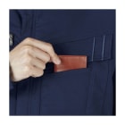 実際に着用すると、生地が柔らかくストレッチが効いていて、とても動きやすいのが印象的です。制電性があるので冬場の静電気対策にも安心。カラーも落ち着いたトーンから鮮やかなブルーまで揃っているので、現場だけでなくイベントや店舗スタッフ用にも使いやすいです。刺繍やプリントで社名やロゴを入れれば、チームユニフォームとして一体感を演出できます。