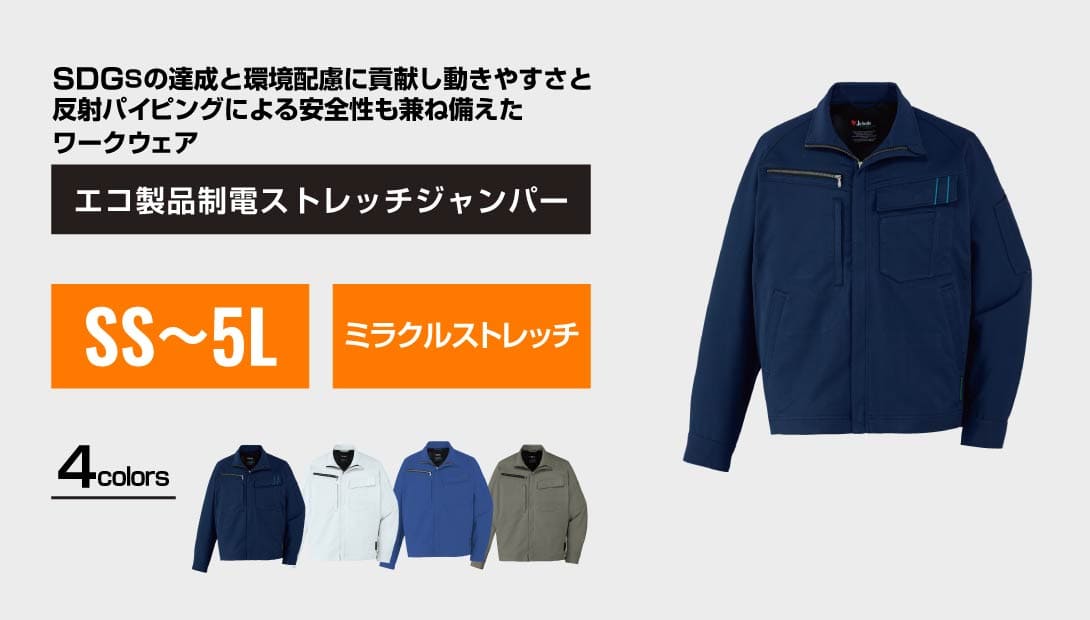環境に配慮しながら高いストレッチ性と制電性を実現したジャンパーです。体の動きにフィットする伸縮性で、長時間の作業も快適にサポート。シンプルなデザインは刺繍やプリント加工が映えるため、企業ロゴやイベント名を入れてユニフォームとしての利用にも最適です。ネービー・シルバー・ロイヤルブルー・スモークグレーの4色展開で、幅広い業種に対応します。