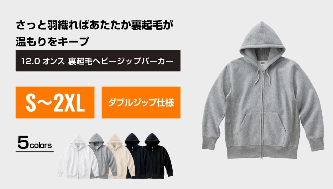 12.0オンスの厚手素材と裏起毛仕様で高い保温性を確保。ダブルジップ仕様で開閉がスムーズにでき、通気や温度調整も簡単です。袖口と裾のリブがフィット感を高め、型崩れを防止。フロントポケット付きで機能性にも優れています。プリント・刺繍加工にも対応し、オリジナルウェアのベースとしても最適です。