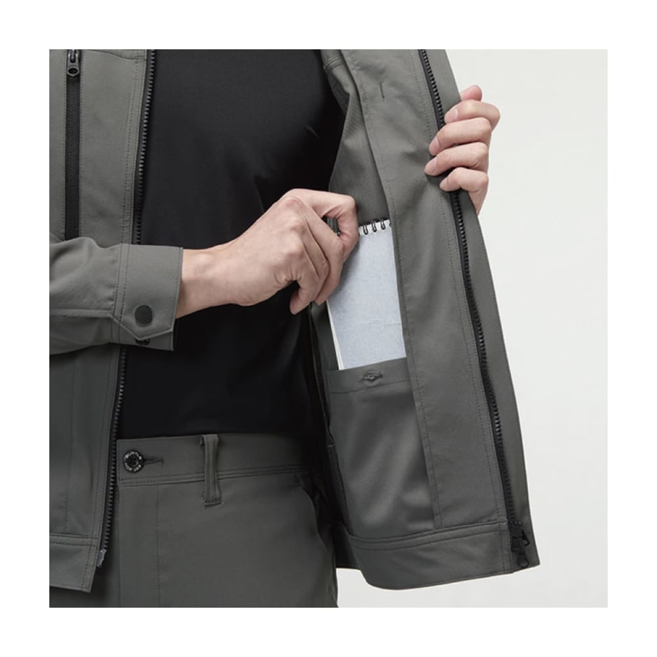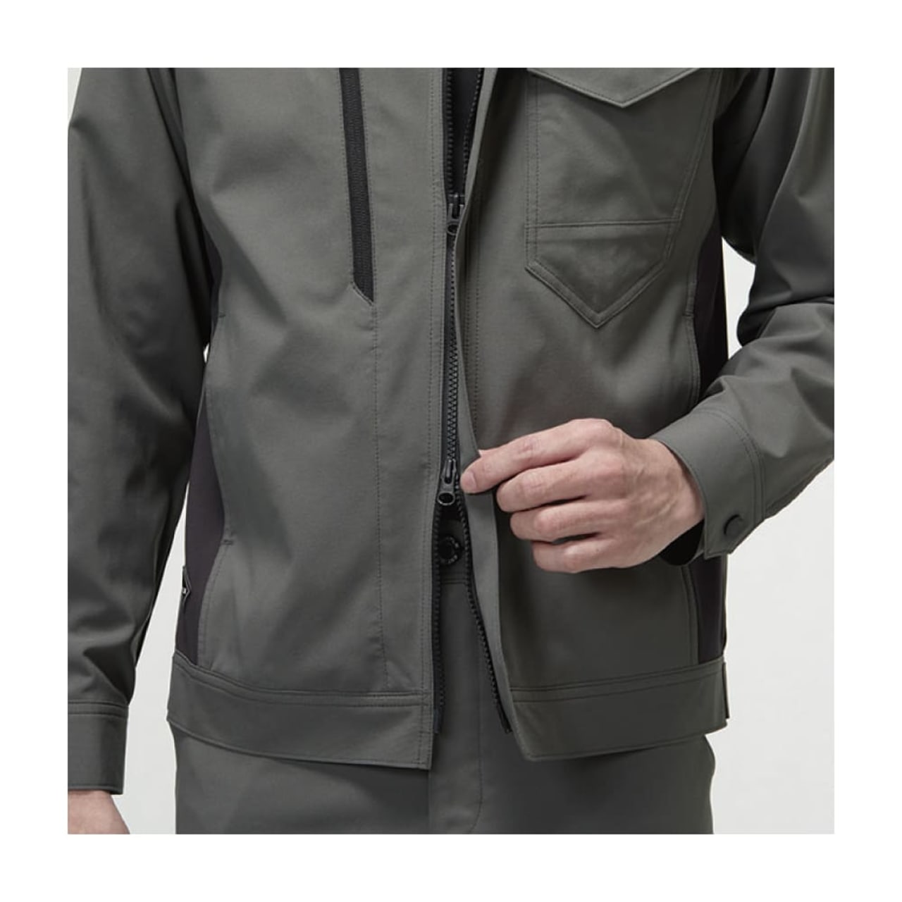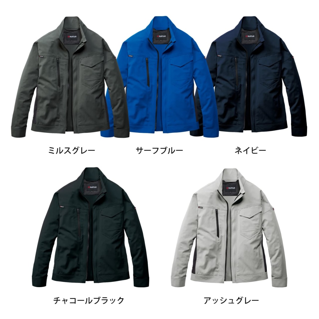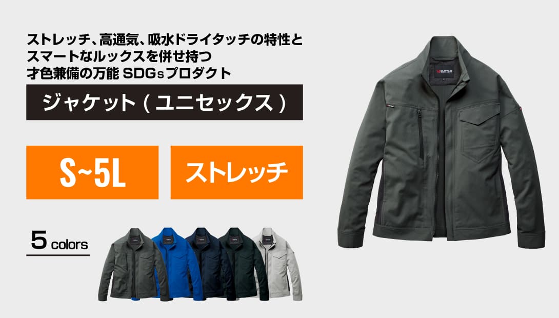 吸汗速乾・高通気・ストレッチ性を備えた夏対応の制電ケアモデル。ダブルジップ仕様に加え、胸元と片腕には出し入れしやすい機能的ポケットを装備。レベルブックやPhone収納も完備した、現場主義のスリムジャケットです。