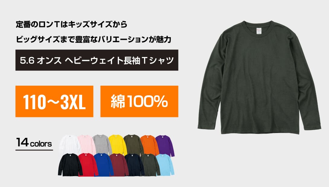 かっこいいスタイルをつくってくれる、ヘビーウェイトTシャツです。シルクプリント、転写、刺繡など多彩な加工に対応しており、豊富なボディーカラーとの組み合わせで制作できるアイテムは無限!こだわりの光るオリジナルTシャツ制作にぴったりのアイテムです。フロントやバックはもちろん、袖や脇腹にもプリントできるので、多彩な表現が可能です。丈夫で存在感のあるオリジナルウェア制作なら、このモデルをおすすめします!